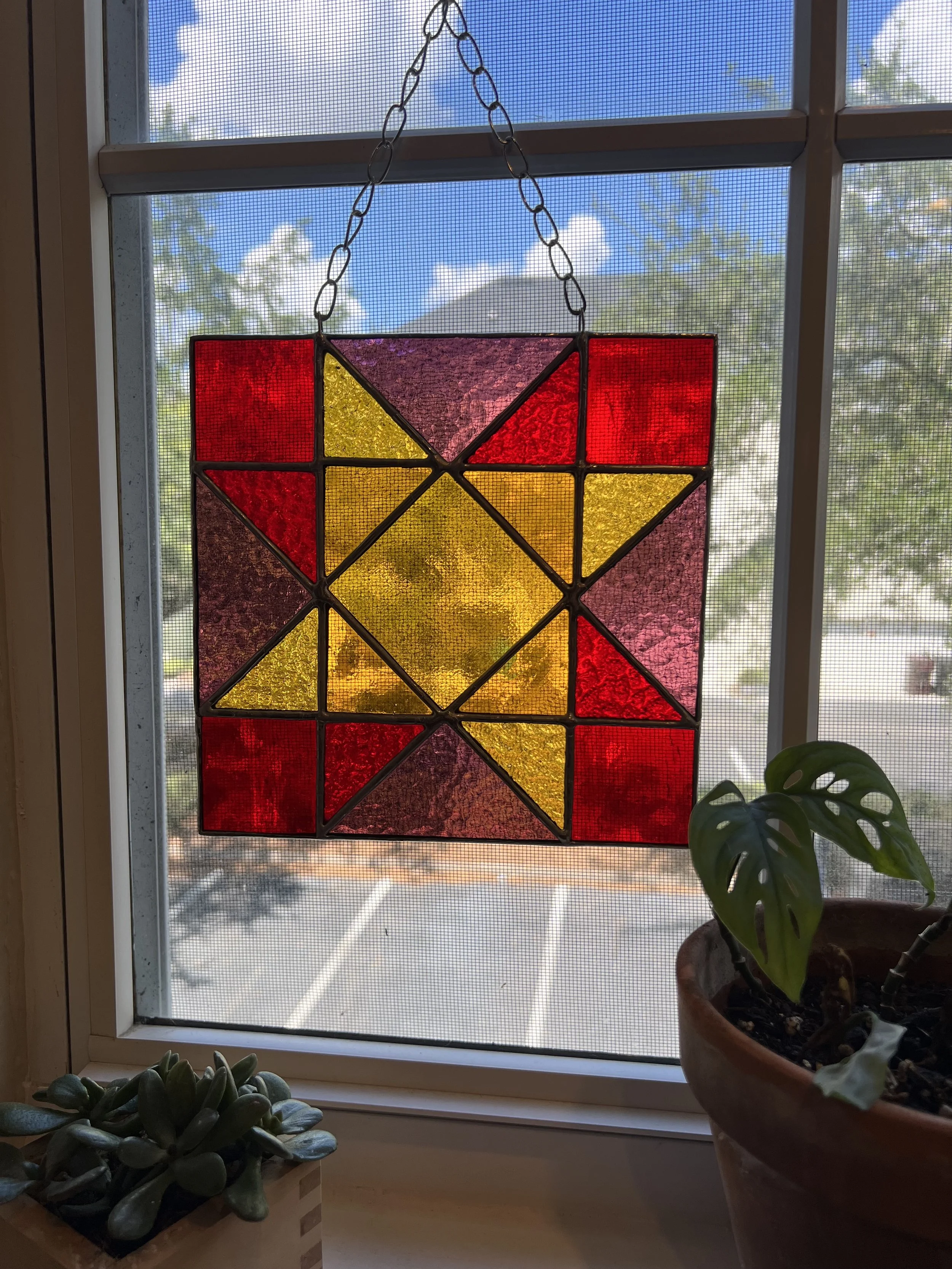 Inspired by the tomato pin cushions we all had in our first sewing kits, this funky panel features red textured glass both for the tomato and the pepper that hangs below. Tomato measures approximately 5.5” tall and 6” wide. The pepper that hangs about 4.5” inches below measures about 2.5” tall by 1.5” wide.